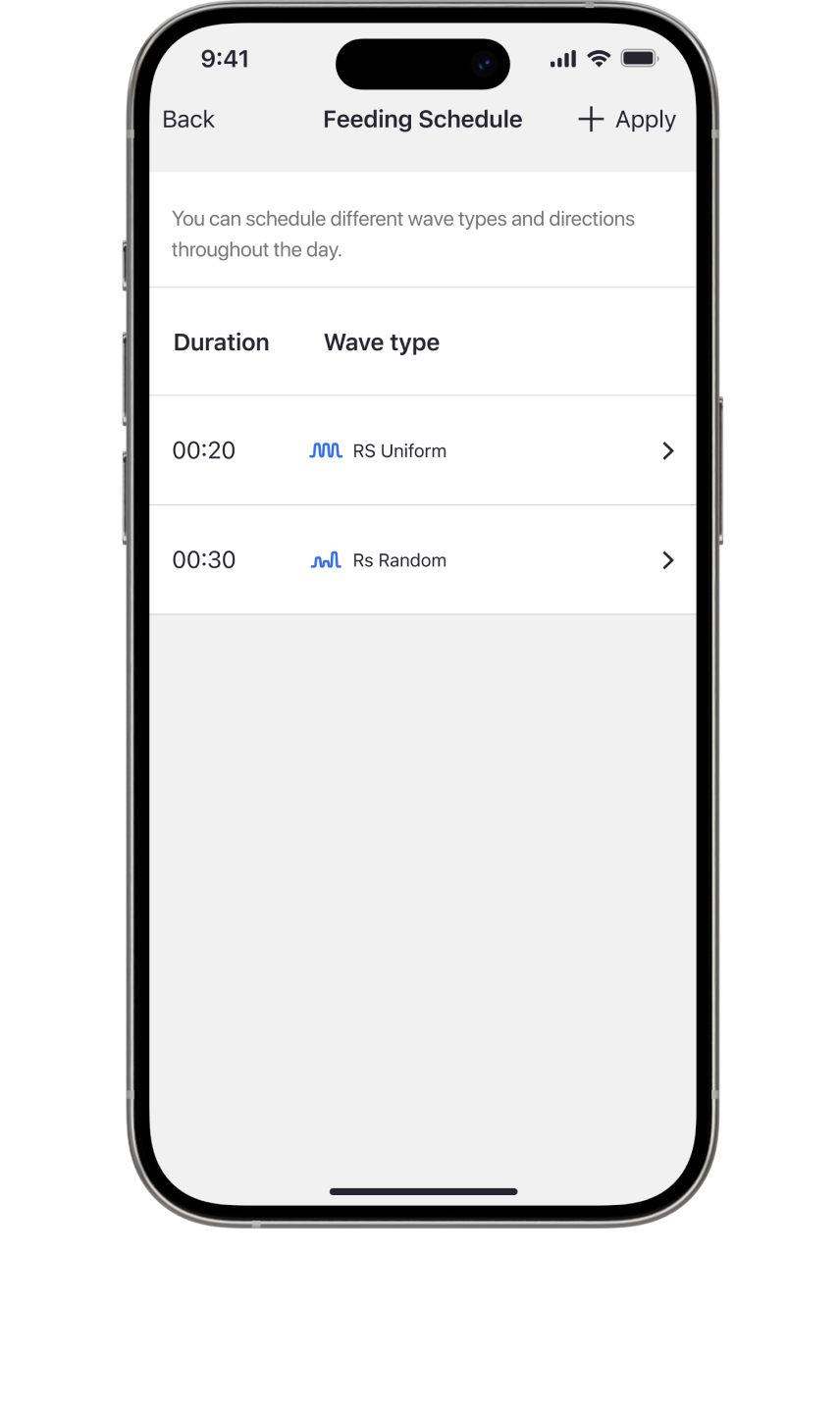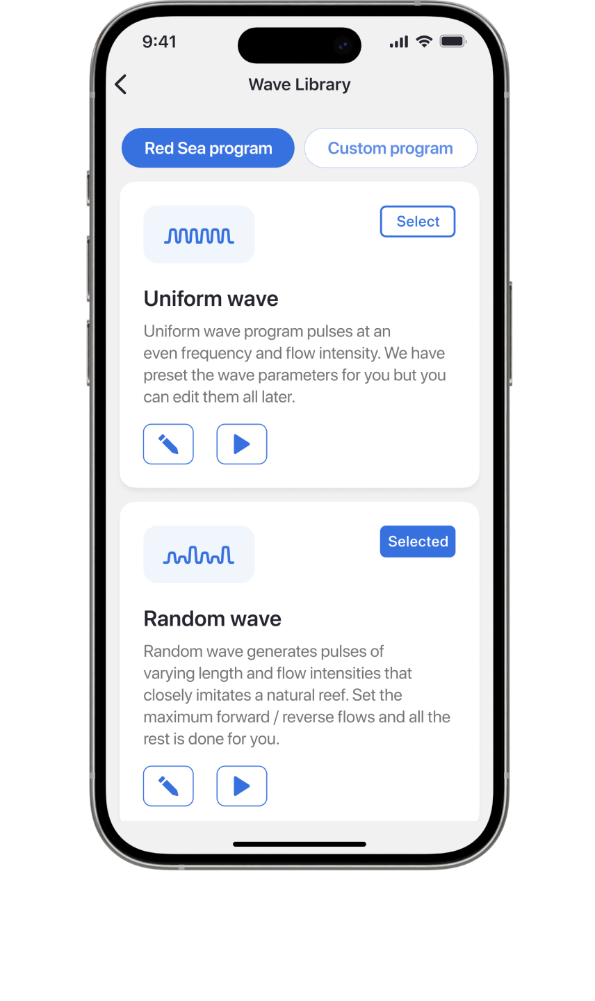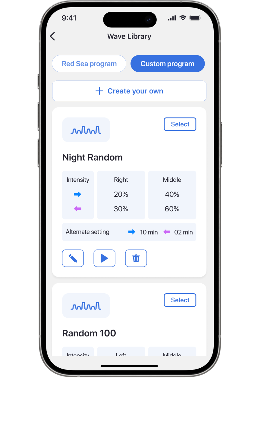 Erstellen Sie mehrere benutzerdefinierte Versionen jedes Wellentyps und speichern Sie sie in Ihrer persönlichen Wellenbibliothek. Sie können die benutzerdefinierten Wellen, die im 24-Stunden-Zeitplan direkt auf Ihre Pumpen oder Aquarien angewendet werden, bearbeiten, löschen, auswählen oder in der Vorschau anzeigen.