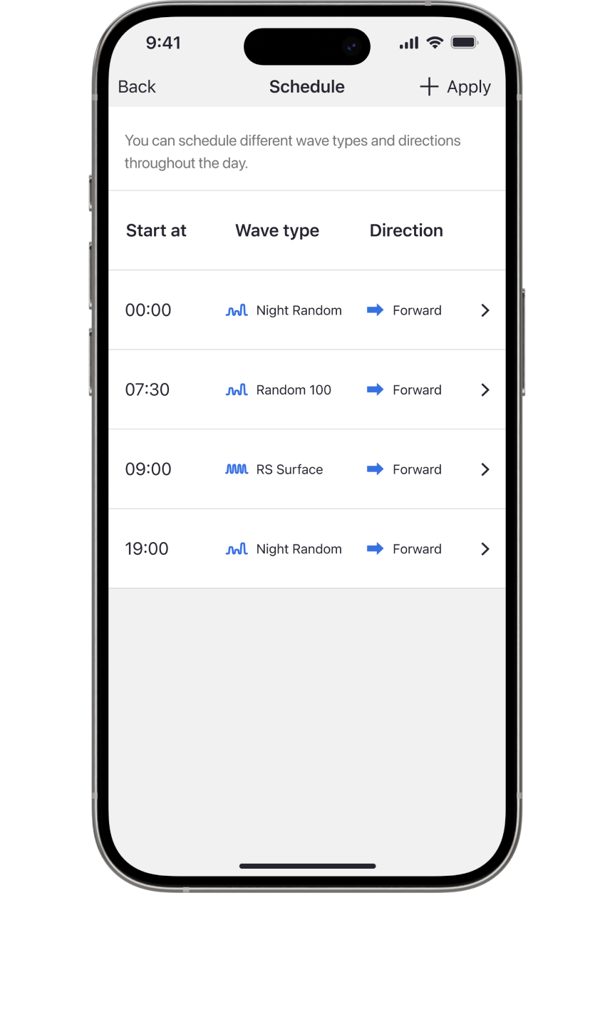 Mit ReefWave können Sie so viele benutzerdefinierte Programme speichern, wie Sie möchten. Mit dem Tagesplan können Sie bis zu 10 verschiedene Wellentypen pro Tag mit unterschiedlichen Pumpintensitäten einrichten.