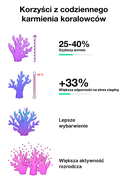Codzienne karmienie najlepiej sprawdza się przy użyciu dedykowanego pokarmu dla koralowców, takiego jak Reef Energy Plus firmy Red Sea, który został zaprojektowany z myślą o maksymalnej efektywności przy codziennym dozowaniu. Łączy on w jednej formule węglowodany, aminokwasy, kwasy tłuszczowe i witaminy. Zapewnia praktyczne, w pełni przyswajalne codzienne źródło odżywiania odpowiednie dla koralowców SPS, LPS, miękkich oraz niefotosyntetyzujących, jednocześnie minimalizując ryzyko pogorszenia jakości wody.