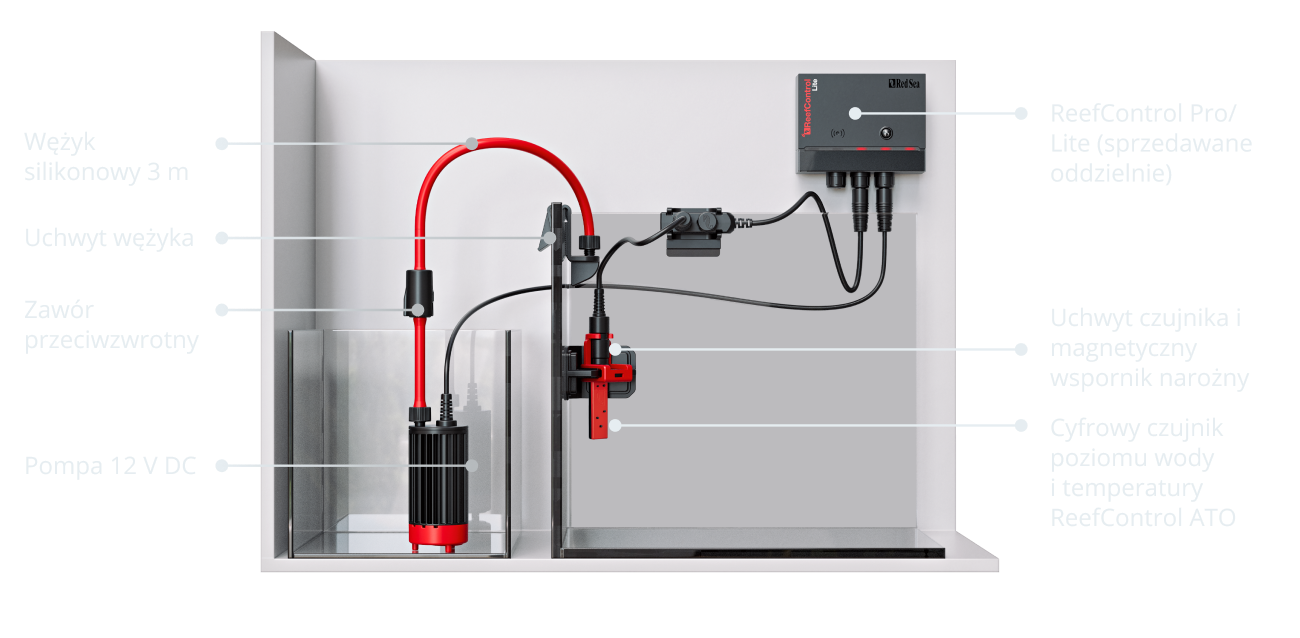 Moduł ATO zawiera cyfrowy czujnik poziomu wody ATO, uchwyt montażowy, pompę ATO, zawór przeciwzwrotny, uchwyt na wężyk oraz silikonowy wężyk.