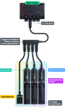 Slim-line, multi-input, titanium probe, solid-state (EC technology) water level sensor, with a built-in digital thermometer accurate to 0.1 degrees, providing real-time monitoring, notifications, and logs. It can also be configured to automatically control DC equipment such as cooling fans, or AC equipment such as heaters, when used in combination with ReefControl Power.