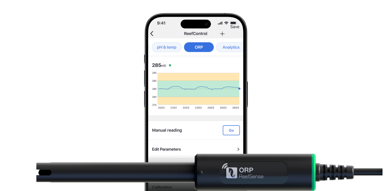 The digital ReefSense ORP probe can be connected to the ReefControl Lite or Pro controllers, providing real-time monitoring, notifications and logs.